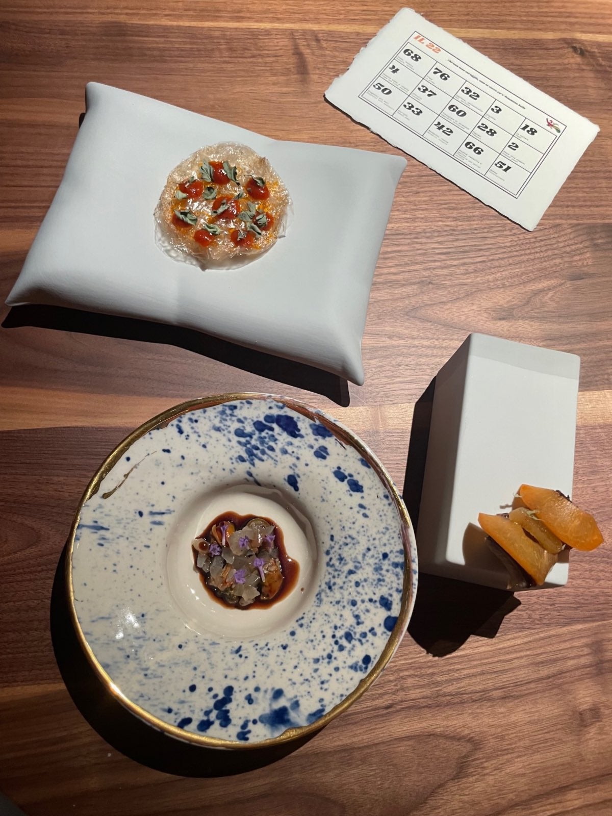 Sorprende, poi, il Fagiano: petto arrostito e filetto crudo, servito con bieta e fondo cipolla, accompagnato da una sorta di gyoza partenopeo: un raviolo piastrato ripieno di genovese. Molto fresca la Scapece di pesca e zucchine, che rinfresca il palato prima di Spaghetti Meatball, l’invenzione della tradizione fatta piatto, che ironicamente Iannotti ha deciso di inserire nel menu. Per servire il piatto numero 33, esce lo chef in sala: è il nostro “Ris’Orto”, ossia l’insalata di riso, dice ridendo, facendo allusione alla simbologia del 33. Molto interessante il pre dessert, a base di Cremoso di rucola, cremoso al mandarino, sorbetto al mandarino e foglia di rucola, che tra amaro e acido prepara al dolce. Si chiude in dolcezza, con il Soufflé alla camomilla, con succo di arancia e gelato al polline: un dessert che trasporta dritto nel mondo dei sogni, dopo un percorso gastronomico divertente e spassoso (a proposito, nella petite patisserie c’è pure lo Spasso napoletano, il classico mix di frutta secca che si sgranocchia durante i giochi da tavolo in famiglia). Si esce felici e divertiti, con la sensazione di aver fatto... tombola!