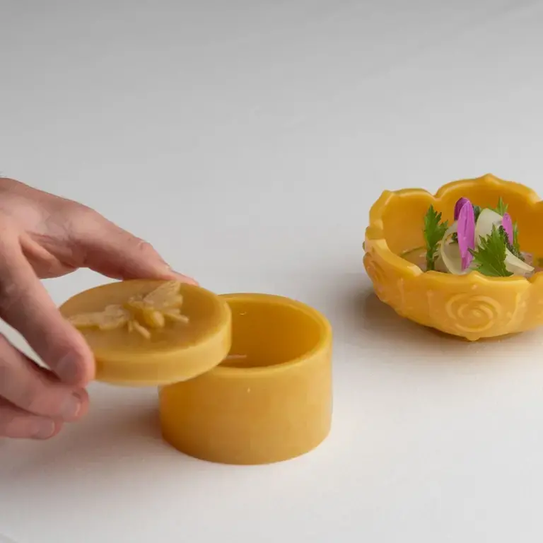 Sciogliete la cera d’api e colatela nello stampo, lasciate raffredare e sformate. Essiccate la rosa e riempitela con polline alle erbe. Mettete la crioestrazione nella salsiera.