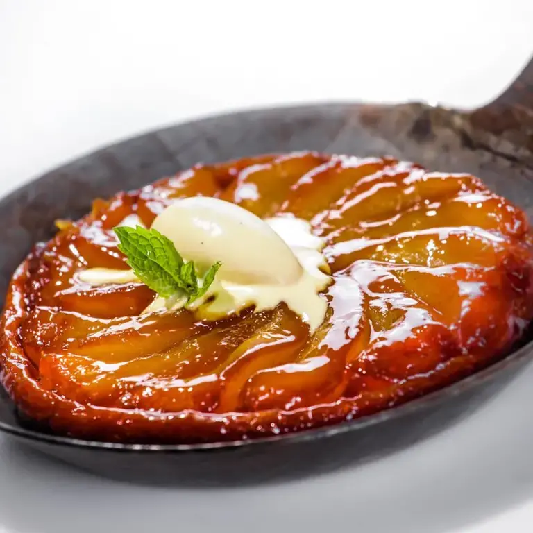 Rovesciare la Tarte Tatin su un tagliere, tagliarla a fette e rimetterla nel suo pentolino caldo. Presentarla, accompagnandola con gelato alla vaniglia.
