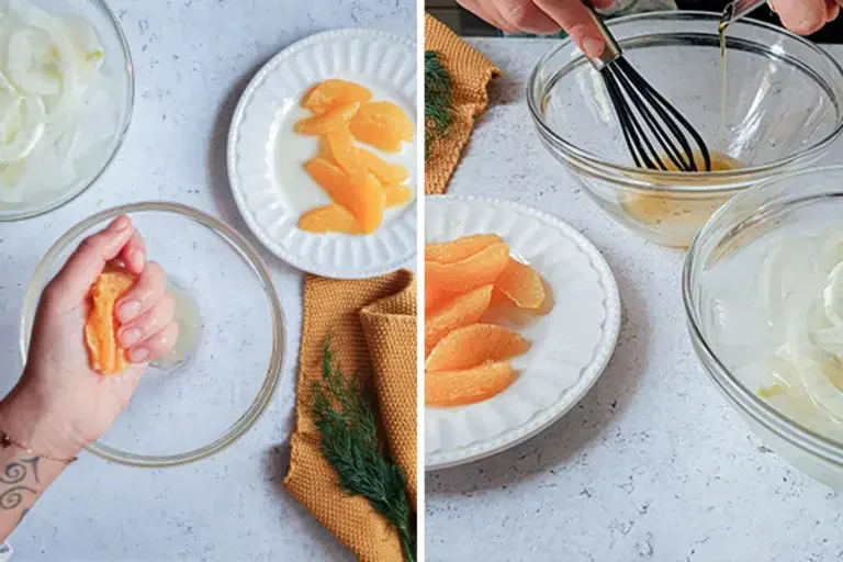 Quello che rimane dell’arancia contiene il succo che userete per il condimento, quindi spremetelo bene in una terrina. Emulsionate il succo d‘arancia con olio, sale e pepe.