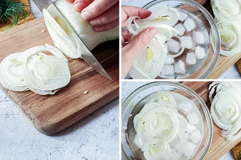 Pulite il finocchio e tagliatelo a fette sottili. Immergete le fette di finocchio in una terrina con acqua e ghiaccio. In questo modo il finocchio diventerà ancora più croccante.