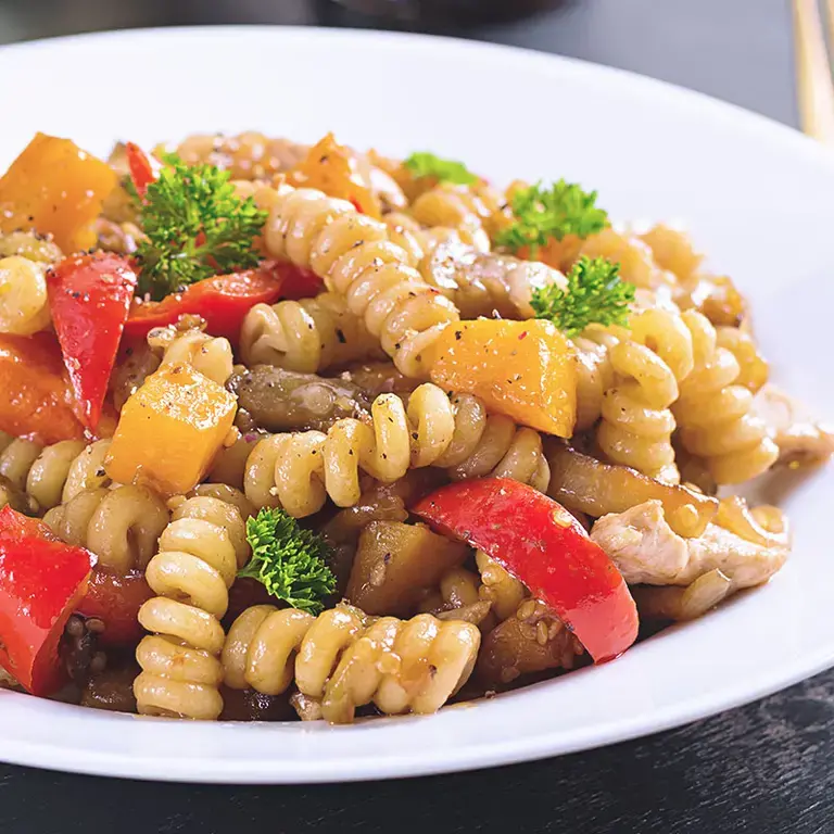Una ricetta per l'estate: scopri la pasta con peperoni alla siciliana, arricchita di olive e basilico per un sapore fresco e gustoso.