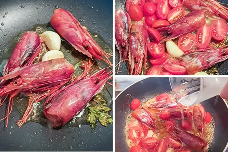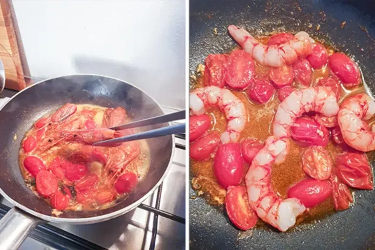 Quando l’aglio sarà imbiondito, aggiungete le teste dei gamberi e i pomodorini tagliati a metà. Tostate il tutto a fuoco vivace e mescolate spesso per evitare di bruciare il fondo. Dopo qualche minuto sfumate con il vino bianco.