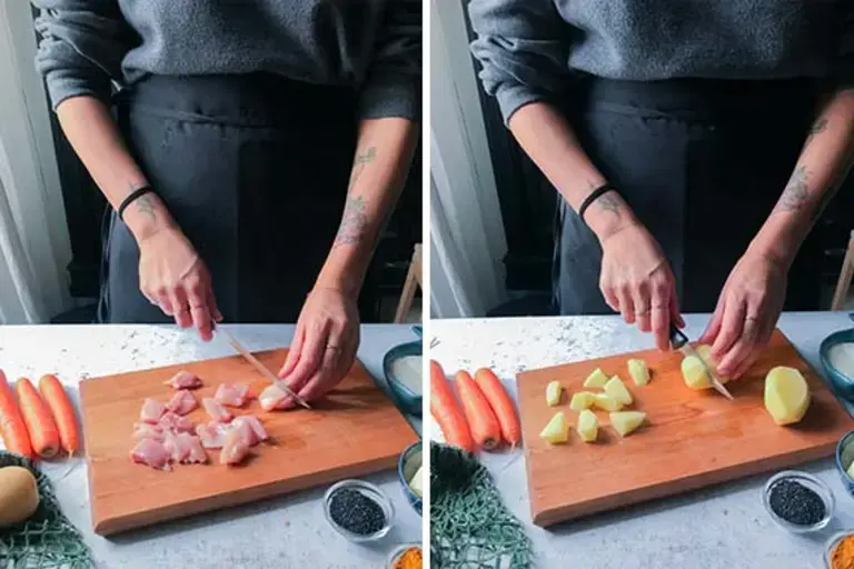 Tagliate la carne a pezzetti. Sbucciate le patate e tagliatele della stessa dimensione.