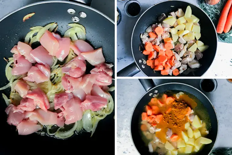 Unite la carne e rosolatela bene, poi coprite con acqua e aggiungete le verdure e il curry. Lasciate cuocere per circa 30 minuti con il coperchio.