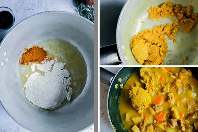 Preparate nel frattempo il roux al curry sciogliendo il burro in un tegamino. Unite la farina e il curry, mescolate bene e quando avrete ottenuto un composto colloso che si staccherà dalle pareti della pentola spegnete.