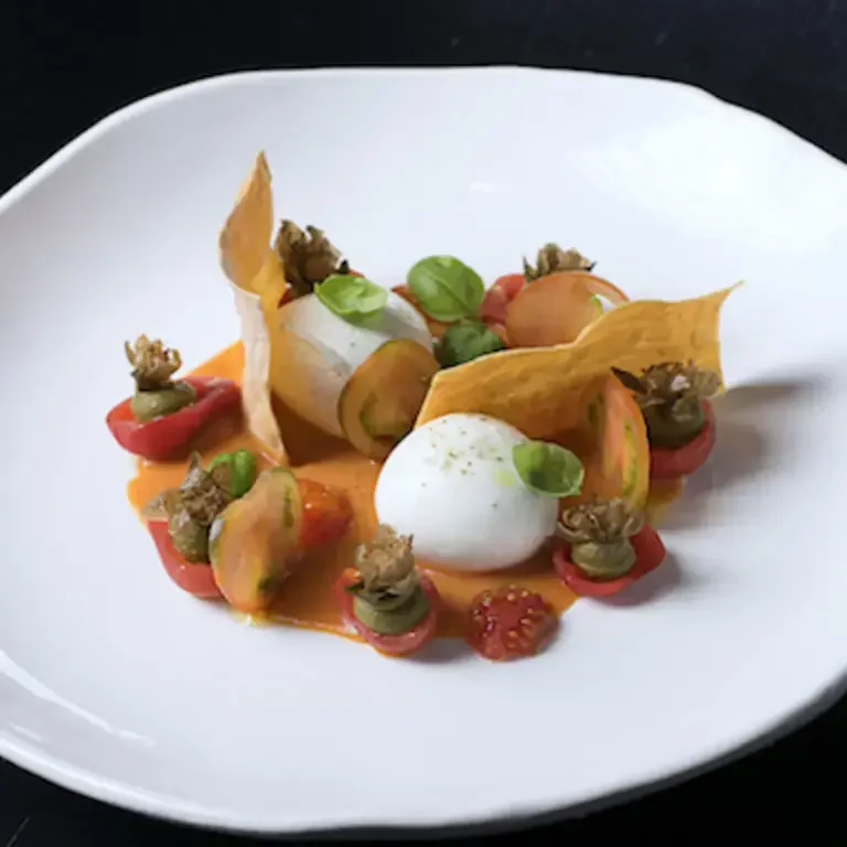 Un twist sulla tradizionale insalata caprese a base di mozzarella di bufala, pomodori Camone e pomodorini ciliegino, capperi fritti e crema di melanzane.