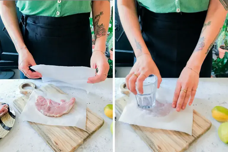 Per preparare le scaloppine al limone, stendete le fettine sul piano di lavoro, copritele con un foglio di carta forno e battetele leggermente. La carta forno proteggerà la carne che non si romperà ma diventerà molto tenera.