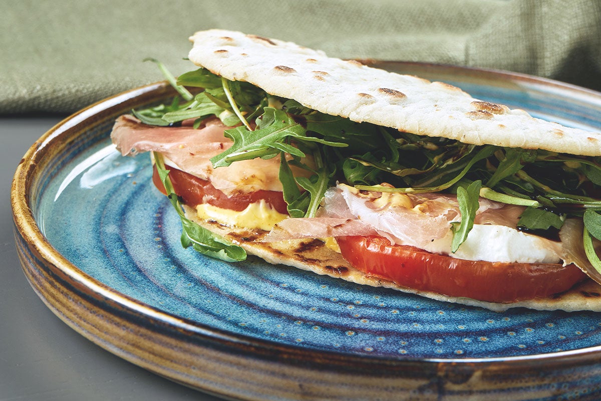 La “classica” piadina romagnola con prosciutto crudo, stracchino e rucola