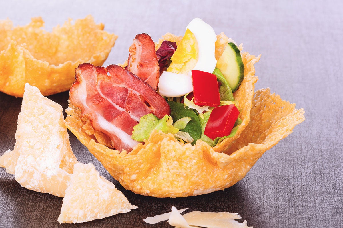 Semplici e veloci da preparare, i cestini di Grana ripieni non offrono solo ottime soluzioni per servire gli antipasti con stile ed eleganza. Le cialde di grana si possono infatti modellare con forme e dimensioni diverse, adatte a contenere ripieni di ogni genere ma perfette anche per dare la componente croccante a zuppe, creme o vellutate. Con l’aggiunta di qualche ingrediente possono anche trasformarsi in chips che solleticano l’appetito. Per preparare i cestini di Parmigiano, iniziate grattugiando finemente il formaggio in una ciotola. Prendete una padella antiaderente e scaldate a fuoco medio. Distribuite il Parmigiano grattugiato in modo da formare un cerchio sottile e uniforme. Lasciate fondere il formaggio fino a quando diventerà leggermente dorato e croccante sui bordi. Con delicatezza prelavate il cerchio di Parmigiano e sistematelo su un bicchiere capovolto in modo da dargli la forma a cestino. Lasciate riposare qualche minuto affinché il cestino si indurisca.
