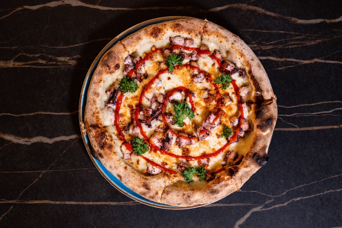 Polpo è una pizza tonda con vellutata di patate, fiordilatte, polpo scottato, pangrattato di semola tostato aromatizzato al capuliato, gocce di crema di peperoni e salsa BBQ. Una morbida vellutata di patate incontra la delicatezza della mozzarella fiordilatte Latteria Sorrentina, mentre il polpo scottato aggiunge carattere e profumo di mare. Il pangrattato di semola tostato aromatizzato al capuliato (una salsa tipica del Ragusano, a base di pomodori secchi tritati grossolanamente, aglio, origano e peperoncino) regala una nota croccante e fragrante, arricchita da gocce di crema di peperoni e un filo di salsa BBQ.