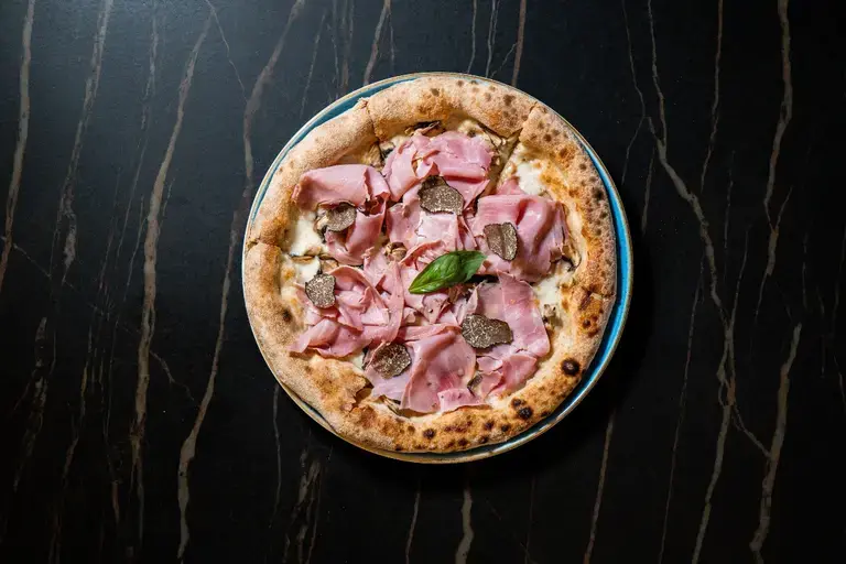 Tartufo&Co è una pizza tonda con fiordilatte, funghi freschi (cardoncello ragusano), prosciutto cotto al tartufo, scaglie di tartufo fresco. La morbidezza del fiordilatte si fonde con i funghi freschi (cardoncello di Ragusa), mentre il prosciutto cotto al tartufo aggiunge una nota avvolgente e raffinata. Le scaglie di tartufo fresco donano eleganza e un aroma intenso.