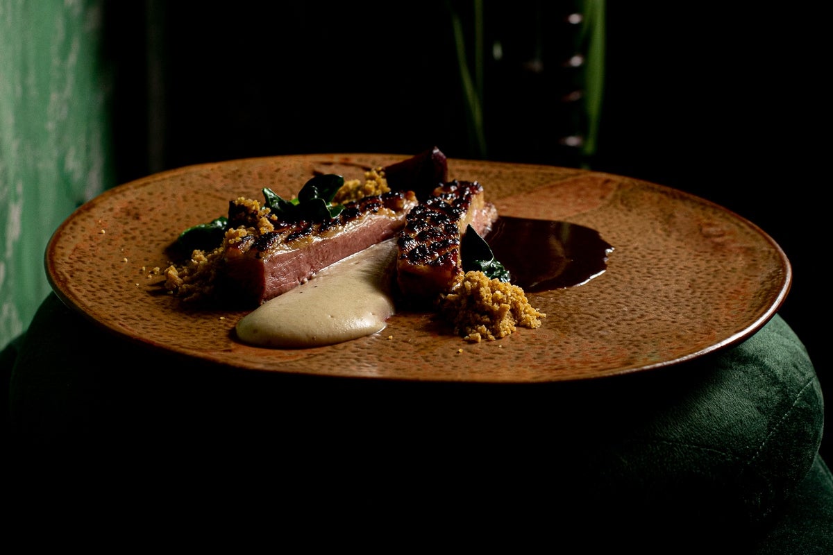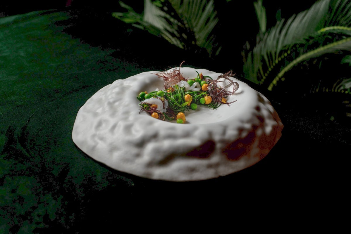 Un piatto che sta avendo tanto successo è Mare Freddo, la portata numero 1: agretti sbianchiti, piselli, calamari tagliati fini a crudo, il tutto condito con acidulato di alga robina (ossia lo sciroppo di carrube, una sorta di melassa), dove aggiungiamo ubemoshi e soia. Finiamo con crema alla huancaina (a base di peperoncino aji limo e alghe croccanti e reidratate). Questo piatto viene abbinato al Sip numero 1, un drink a base di frutto della passione, estratto di cappero, pisco infuso di yuyo (un’alga che cresce solo in Perù e in Nuova Zelanda, ed è la stessa che si trova nel piatto; ha il gusto del mare al palato, ha una salinità perfetta), estratto di cappero, zucchero e limone.