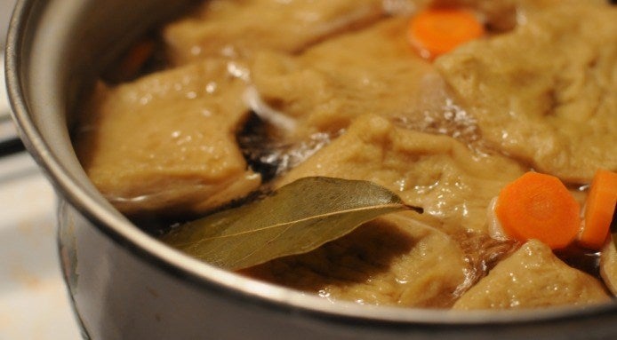 Fate scaldare un’abbondante quantità di brodo vegetale in una pentola. Aggiungete la salsa di soia e l'alga kombu. Quando il brodo arriverà a ebollizione, aggiungete l’impasto avvolto nel canovaccio di cotone. Lasciate cuocere per circa 30 minuti.