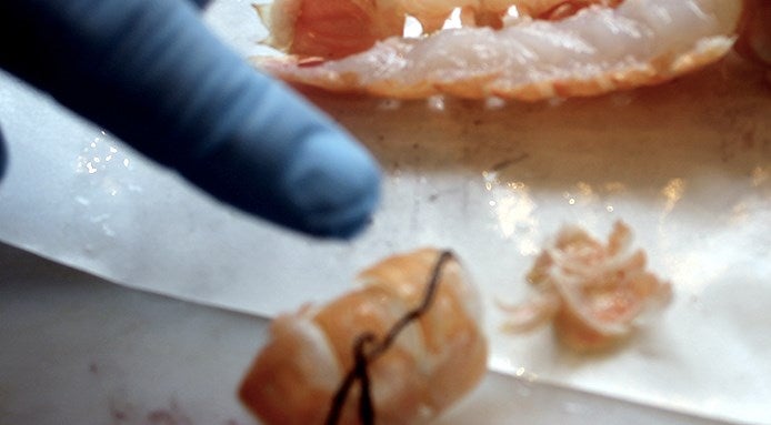 • Ora che avrete estratto la polpa dello scampo, rimuovete il filo intestinale, prestando attenzione a non romperlo
