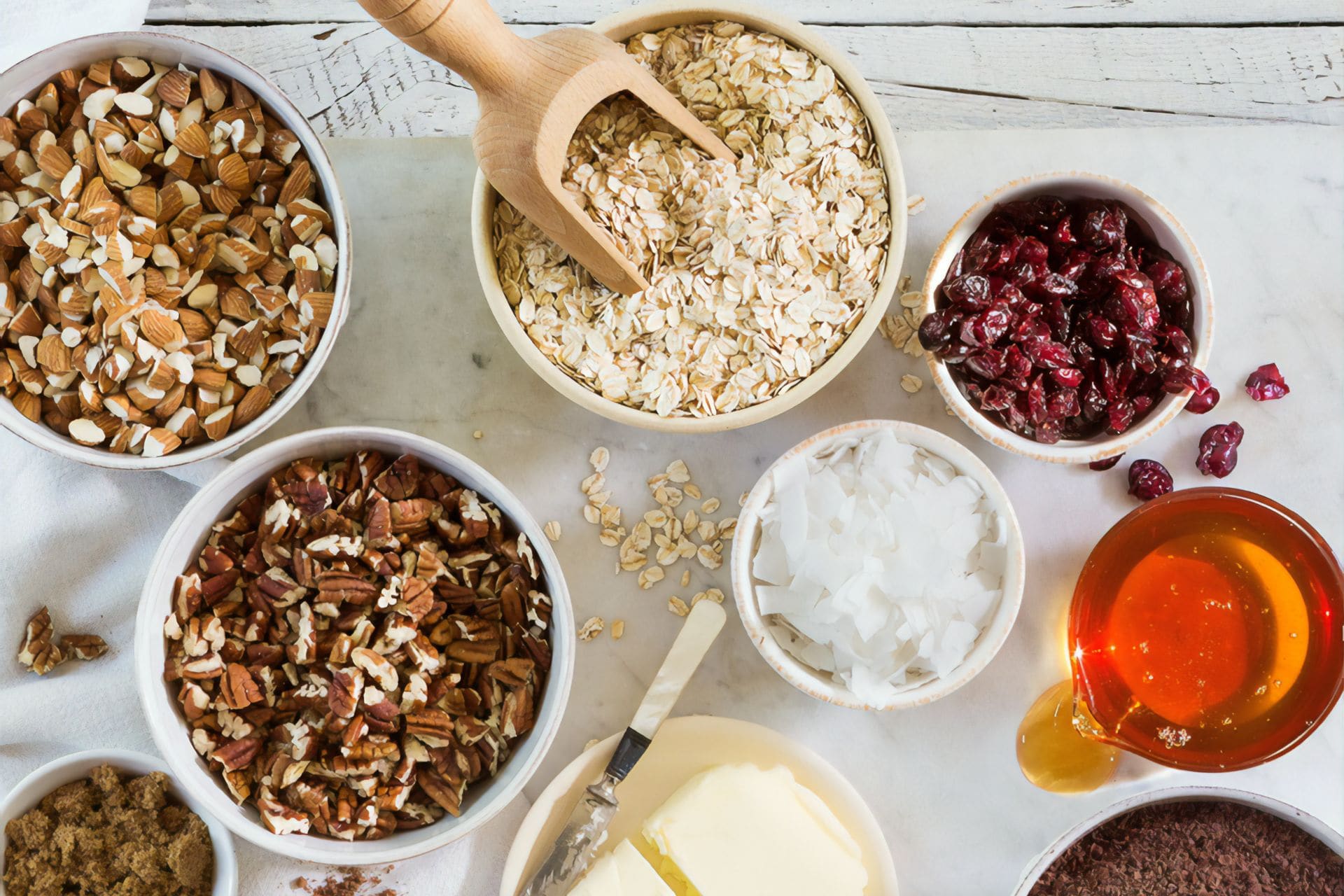- Tritate finemente la frutta secca mettetela in una scodella capiente. Unite l'uva passa, i semi di zucca, i due tipi di fiocchi d'avena, i fiocchi di farro e lo zucchero e mescolate bene fino a ottenere un mix omogeneo.