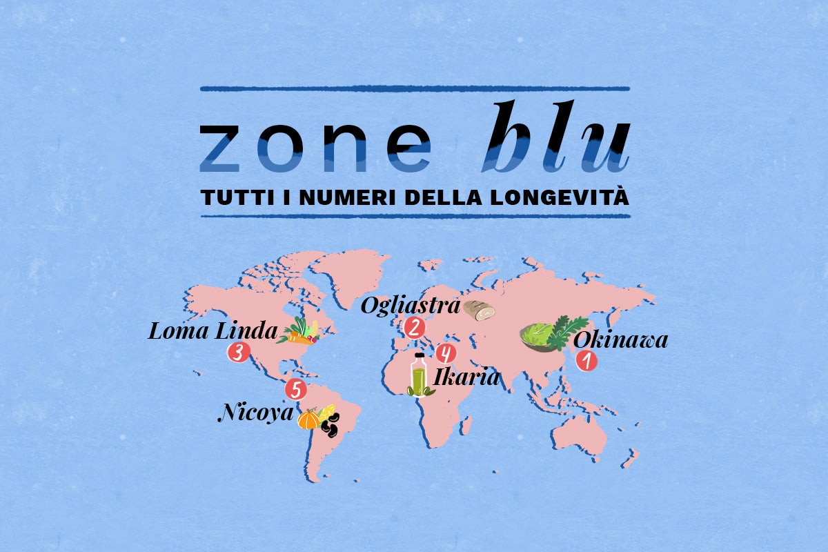 Abbiamo raccolto in un’infografica i numeri e l’alimentazione delle 5 zone blu del mondo e trovate qui un approfondimento sull’unica zona blu italiana che si trova in Sardegna.