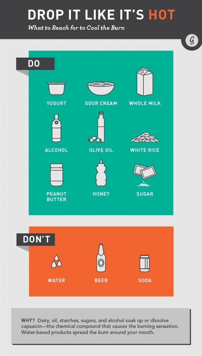 Quest'infografica sfata alcuni miti che, ammettiamolo, sono più diffusi di quanto crediamo. Prima di tutto, bere acqua non aiuta, e nemmeno birra o bibite varie ed eventuali. Non hano alcuna capacità di dissolvere (o quantomeno lenire) l'effetto della capsaicina, il componente chimico responsabile della sensazione di bruciore.