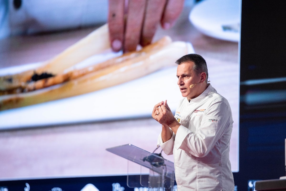 La Sala Blu 1, apre le sue porte con Identità di Formaggio, una serie di appuntamenti interamente dedicati all’eccellenza casearia. A inaugurare questa sessione c’è Bobo Cerea che non ha di certo bisogno di presentazioni. La famiglia Cerea è uno dei simboli più importanti dell’alta ristorazione in Italia e nel mondo e quando si parla di disobbedienza, vengono in mente Bruna e Vittorio Cerea, quando nel 1966 hanno aperto il loro primo ristorante a Bergamo portando sulle tavole il pesce, ingrediente insolito per quel territorio e quell’epoca. “Disobbedire, oggi, vorrebbe dire appassionarsi alla cucina e alla gastronomia con un approccio più duraturo e intenso dal punto di vista dei sogni e delle ambizioni”, dice questo Bobo Cerea parlando del tema di questa edizione. Interessante il piatto portato durante l’intervento, una rivisitazione del cappuccino all’italiana in versione salata. Si tratta di un piatto completamente vegetariano in cui il formaggio, Parmigiano Reggiano nello specifico, è protagonista. Immaginate un cappuccino composto da caffè e schiuma di latte e ripensatelo in versione salata. Il “caffè” è ottenuto da sole patate cotte al forno con cui viene poi preparato un brodo dal gusto molto intenso che viene fatto sobbollire fino a 12 ore. La schiuma del cappuccino è al sifone ed è preparata con un Parmigiano giovane, latte e latticello a conferire una piacevole nota acidula. A guarnire non c’è ovviamente la polvere di cacao, ma una generosa grattugiata di tartufo nero pregiato. “È il cliente che fa diventare iconica una ricetta”, dice Cerea e questa è sicuramente destinata a lasciare un segno tra i piatti memorabili di questo team.