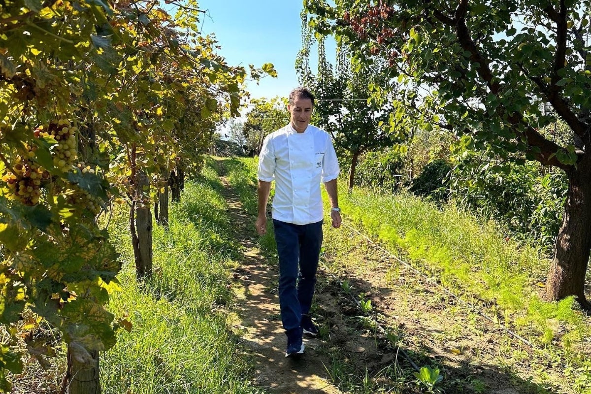 In questa frazione di Massa Lubrense che guarda emblematicamente verso Napoli da un lato e verso il mare di Salerno dall’altro, la rivoluzione è iniziata quando, in tempi non sospetti, trent’anni fa, i fondatori Livia e Alfonso Iaccarino hanno deciso di acquistare un terreno nella vicina Punta Campanella e creare un’azienda agricola biologica, Le Peracciole, per l'autoproduzione di frutta e verdura, con tanto di limonaia e pollaio, da cui ancora oggi arrivano tutti i giorni le uova fresche. Circa otto ettari nella parte più impervia di Punta Campanella, dove la coltivazione è eroica, tra terrazze, discese e salite. Ma qui, se fosse necessario dirlo, la fatica è ripagata da una vista senza eguali, da un incredibile affaccio sul blu e sull’isola di Capri, che appare sempre più vicina, man mano che ci si inoltra nella tenuta e si discende verso la scogliera.