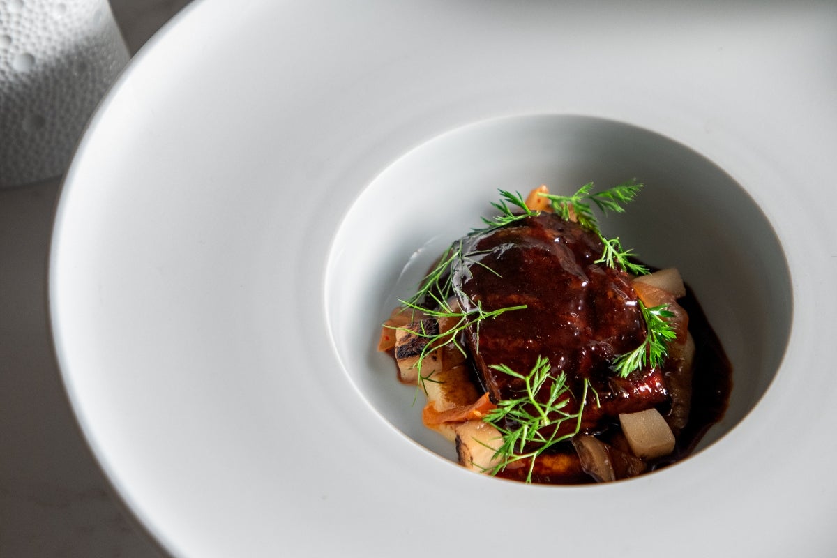 Guancia di maiale, fieno, kimchi e topinanbur