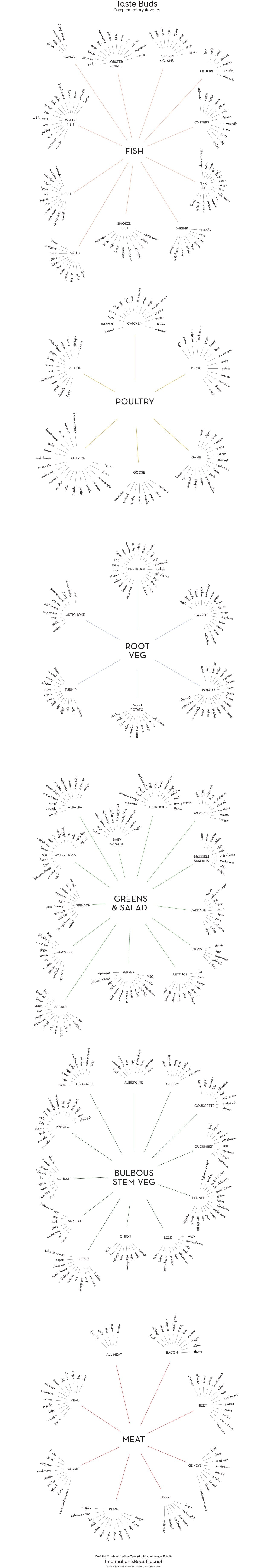 Questa tabella di abbinamento dei cibi creata da Information is Beautiful ne è un esempio perfetto. Partendo da 6 "macro-alimenti" (due categorie di carne, una di pesce, tre di verdure) passa poi a analizzare elemento per elemento.