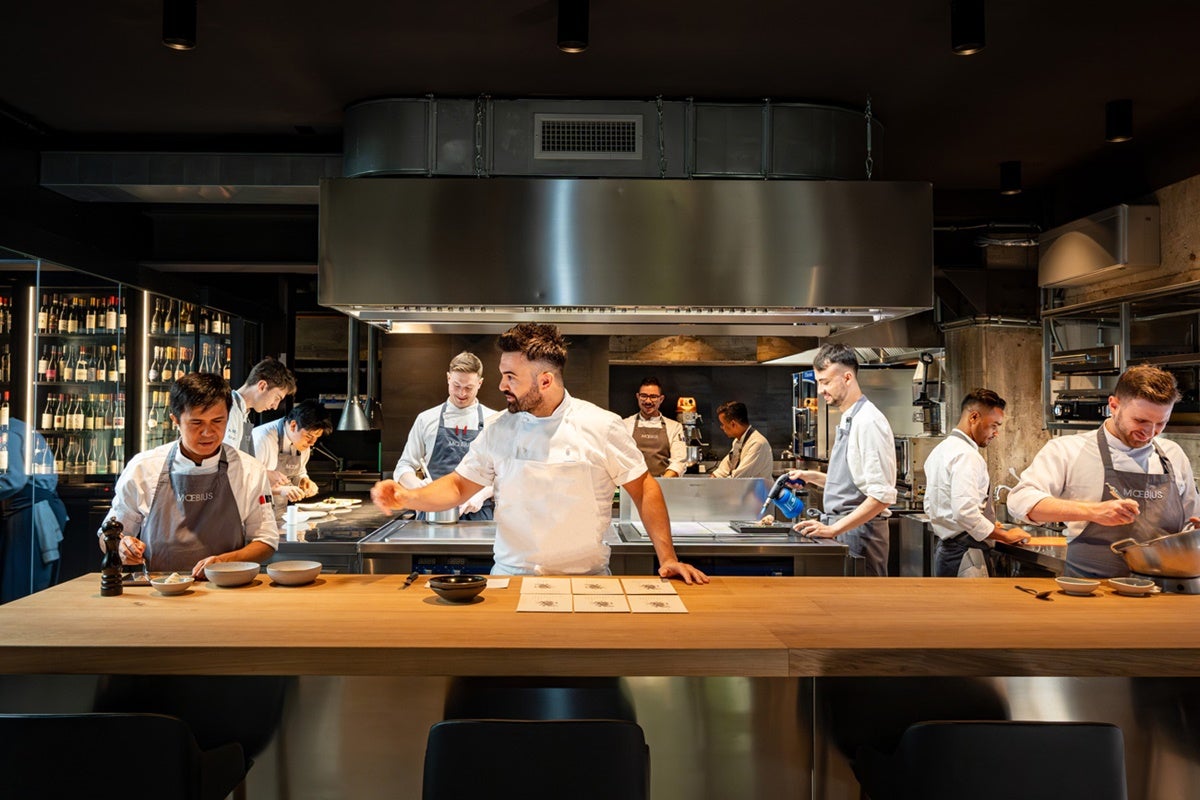 Abbiamo già parlato di Moebius nel 2019 anno della sua inaugurazione: un progetto ambizioso in una location suggestiva e molto ampia che trova il cocktail bar al piano terra, insieme alla sala del tapas bistrot e un primo piano su un soppalco trasparente destinato al ristorante fine dining. Pandemia e lockdown hanno rallentato l’apertura del nuovo concept di chef Enrico Croatti che finalmente oggi si mostra alla meneghina con uno spazio di soli 14 coperti di cui 6 al bancone rivolti alla cucina che mette in contatto chef e ospite eliminando ogni distanza.
