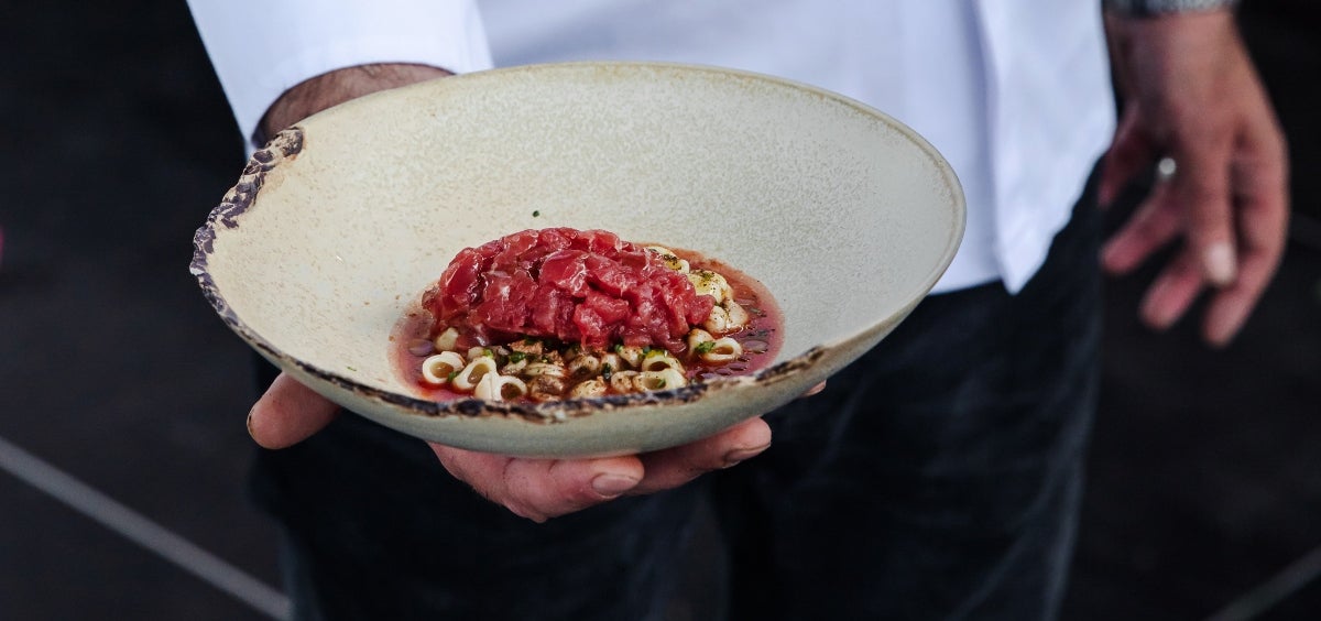 Una volta pronti tutti gli elementi, si procede alla composizione del piatto: le conchiglie fredde, il succo di pomodoro freddo, la polvere di capperi, la tartare di tonno, per chiudere con la bottarga di tonno fritta e sbriciolata al posto del Parmigiano. Un filo di olio a crudo e il gioco è fatto: buona pasta al tonno a tutti!