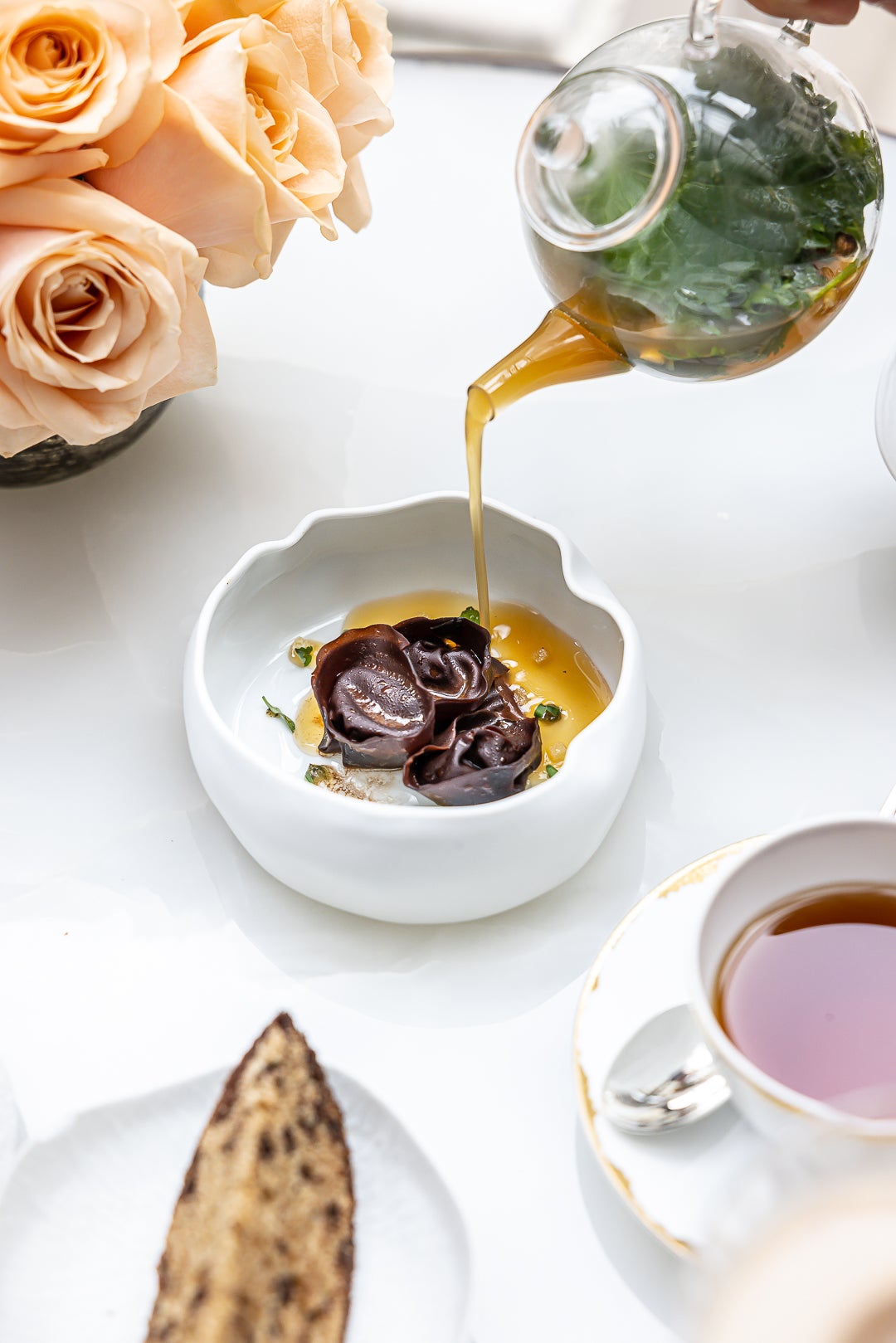 Per il dressage Nelle teiere trasparenti metti qualche bastoncino di citronella, foglie intere di shiso e qualche pezzetto di zenzero. Nel piatto, cospargi il fondo con pezzetti di zenzero candito. Metti alcuni puntini di gel di shiso. Disponi i germogli su tutto il piatto (crescione di coriandolo, atsina e melissa). Adagia i ravioli caldi. Versa il brodo molto caldo nella teiera.