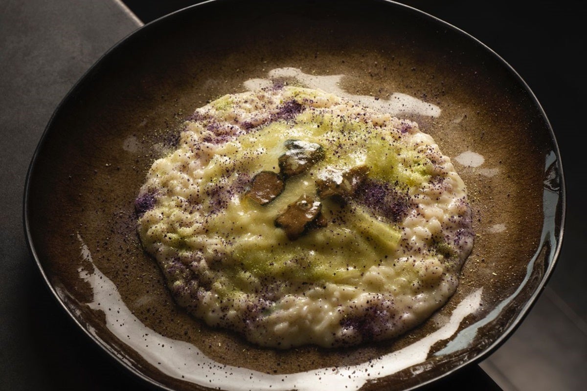 È un risotto che non uscirà mai dal menu, magari subirà qualche modifica col tempo, ma lo lascerò sempre. Ha una crema parmantier alla base, quindi patate, porri e panna. Sotto la base di risotto bianco c’è un ragù bianco di maialino delle mie zone e asparagi viola di Albenga. On top metto un carpaccio di tartufo nero estivo e copro con un velo gel di asparago. Aggiungo infine la polvere di asparago che ricavo dagli scarti di questo ortaggio per me delizioso.