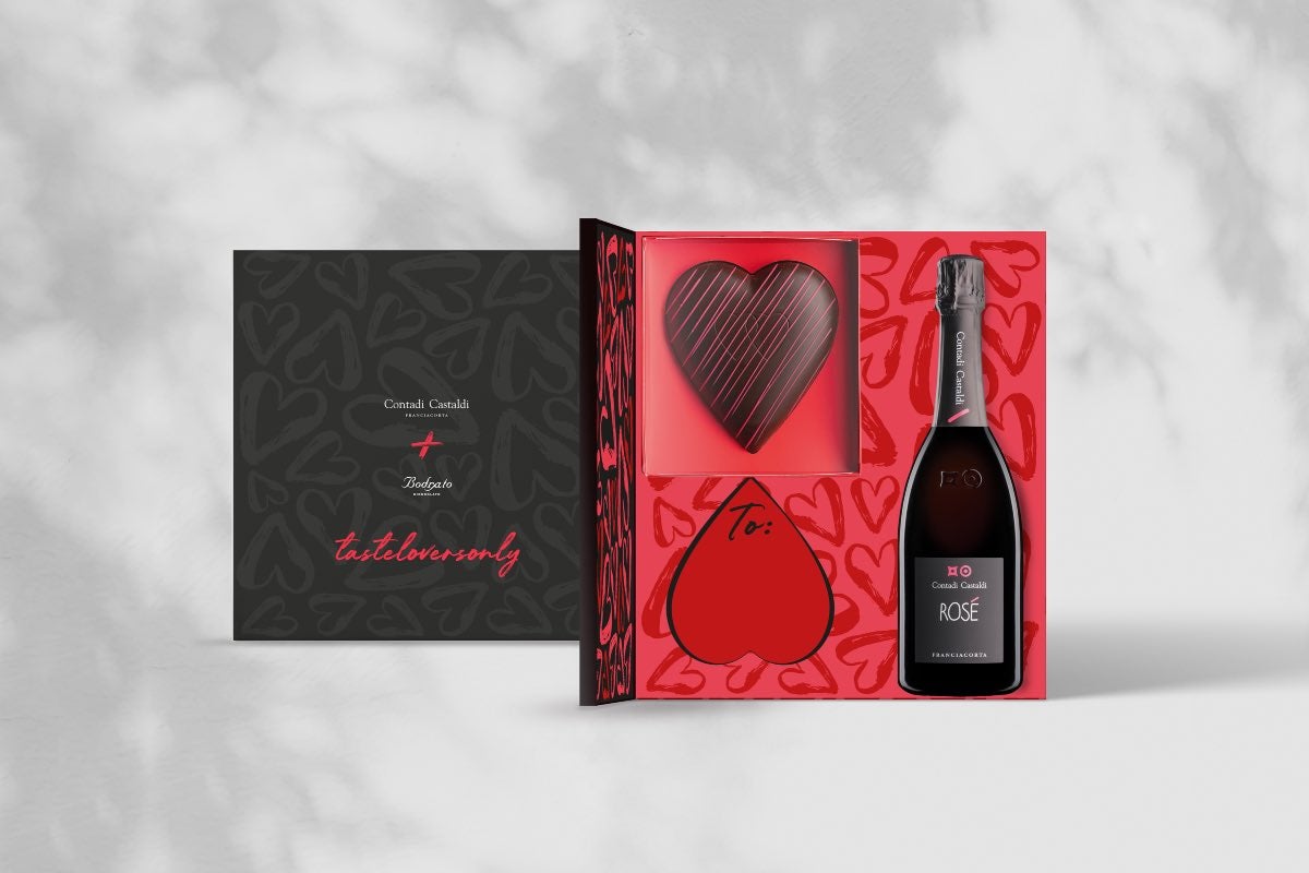 Quest'anno, tra le novità di San Valentino 2023, la maison Bodrato propone il Cofanetto con cuore fondente e spumante rosé. La confezione, in cartoncino rigido rivestito da una carta con disegni di cuori stilizzati, vede la collaborazione di Bordato con la cantina della Franciacorta Contadi Castaldi. Non manca uno spazio per la dedica, composto da un grande cuore rosso che può contenere una frase da dicare alla dolce metà. La confezione, limited edition, si trova nelle principali enoteche e i negozi specializzati di fine food.