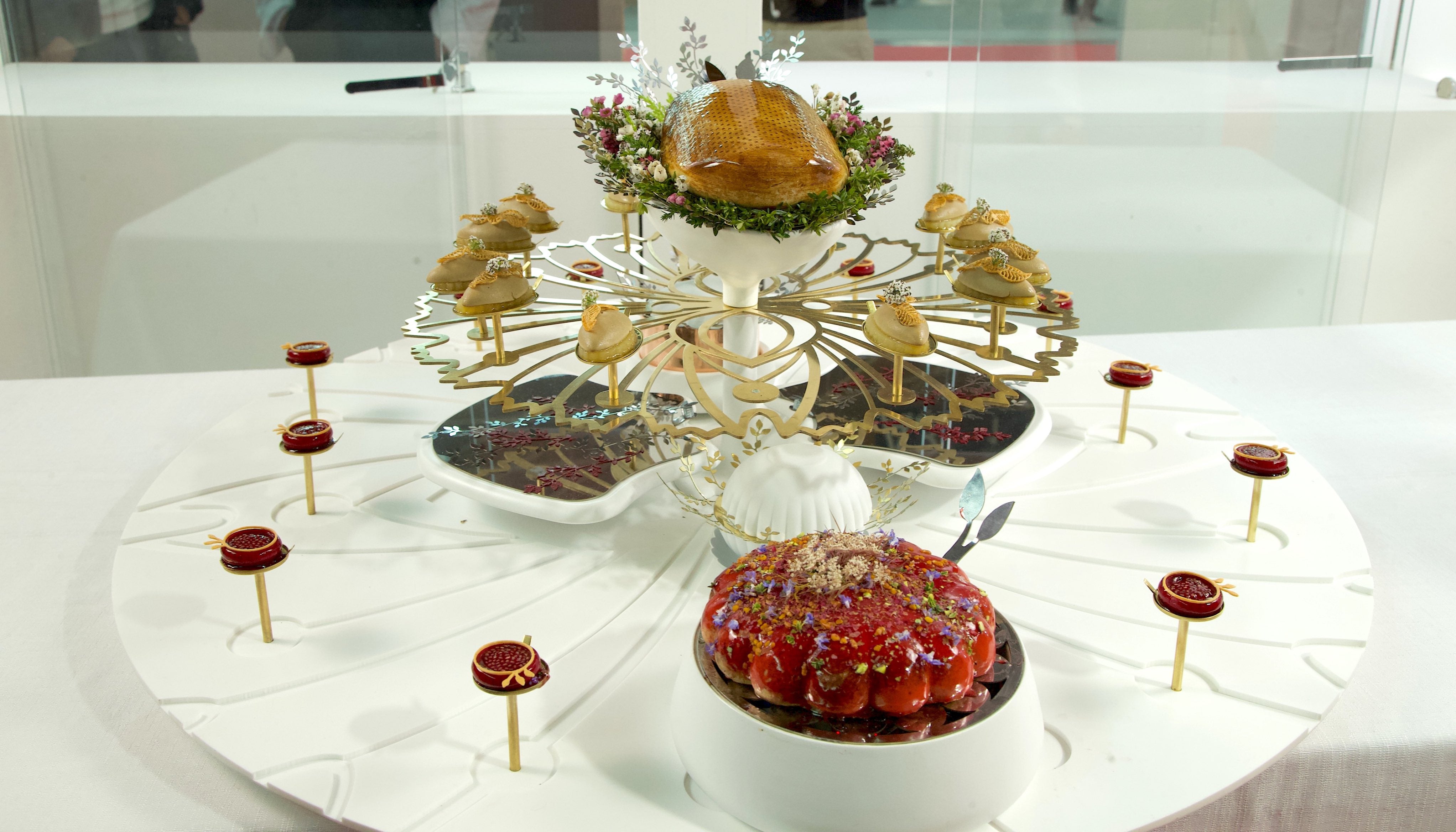- Vassoio: Terrina di pollame, funghi e topinambur, petto d’anatra, il suo fondo e olio di alloro e timo limonato.