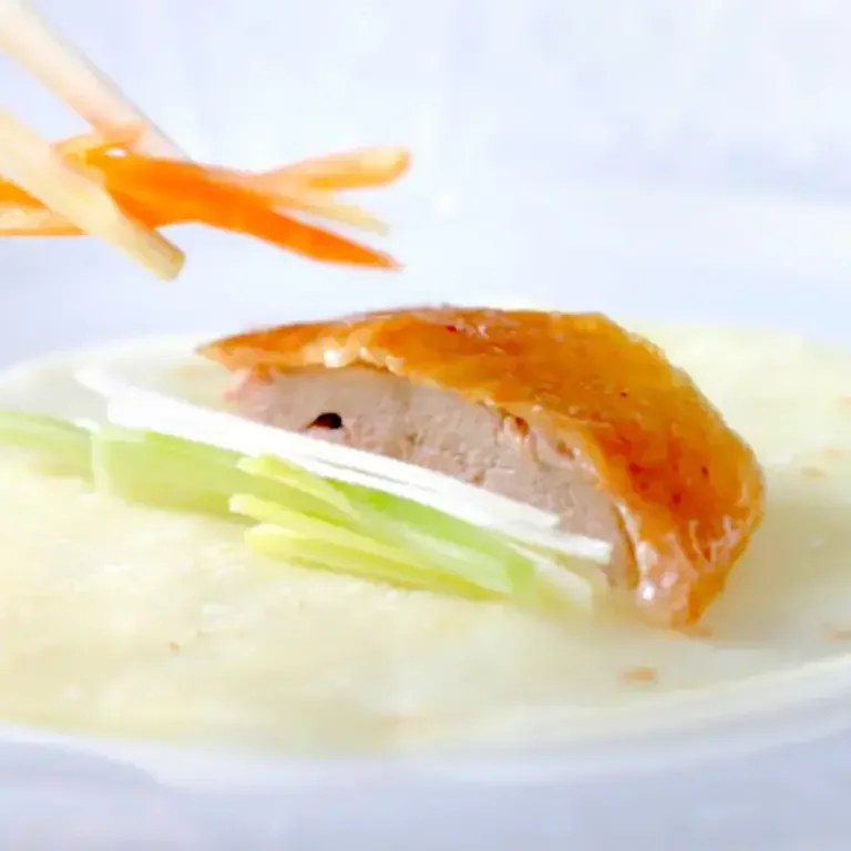 L'anatra alla pechinese, preparata secondo la ricetta originale dal ristorante Bon Wei di Milano, servita nelle tradizionali crepe di farina di riso e verdure.