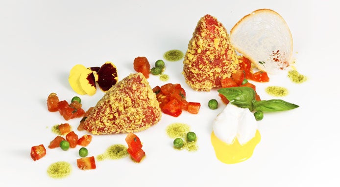 Passare gli arancini nella polvere di risotto, porre sul piatto accompagnati dalla concassè, dall'uovo, i piselli, il crostino e le foglie di basilico. Servire fresco e mai freddo.