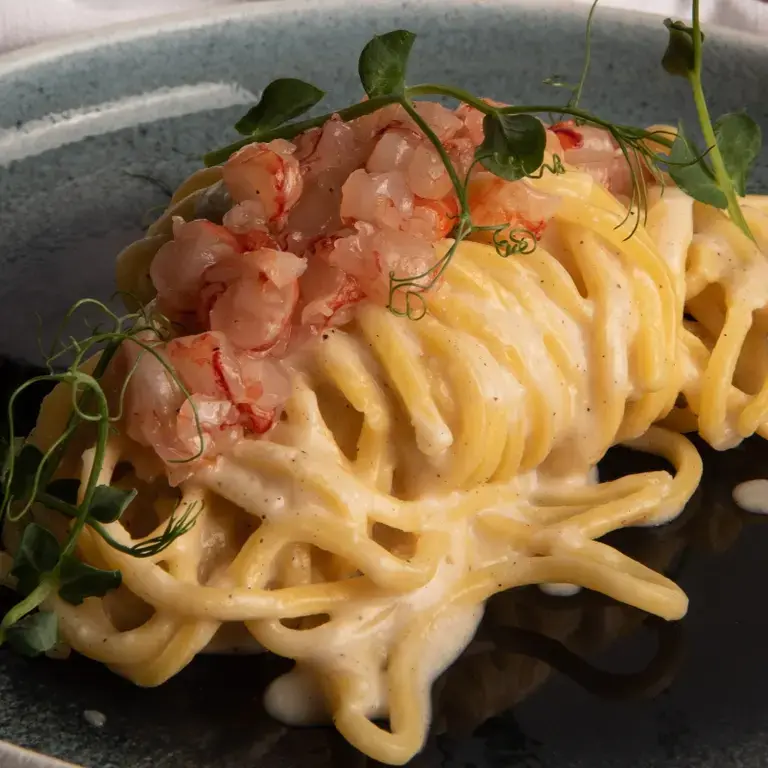 - Con l’aiuto di un forchettone, formare un nido disteso di tonnarelli mantecati con la crema cacio e pepe, adagiare sopra tutta la pasta la tartare di gambero battuta a coltello, condita con un filo d’olio extravergine, infine con uno squize da cucina guarnire con la bisque fredda di gambero.