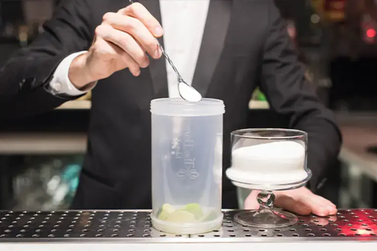 Chiudere nello store and pour e shakerare. Secondo la tradizione del Brasile, non si utilizza lo shaker classico perchè le pareti in metallo potrebbero spezzare il ghiaccio. La plastica dello store and pour, invece, aiuta a favorisce l'emulsione degli ingredienti senza far rompere il ghiaccio.