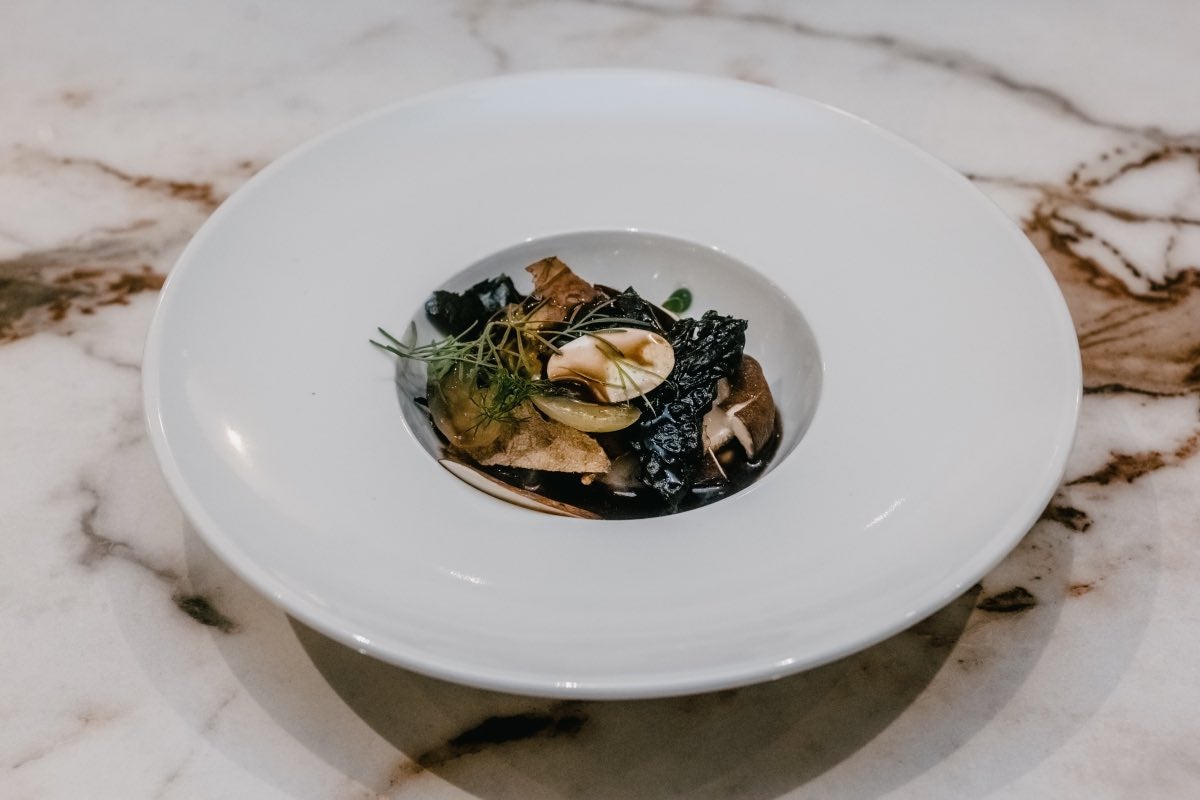 Un piatto vegetariano, perfetto come antipasto, capace di esprimere la quintessenza dell'autunno. Attinge dai boschi romagnoli ingredienti come funghi e uva, ma allo stesso tempo guarda a Oriente per il tipo di tecniche e di preparazioni usate. Ecco allora fermentazioni, acidificazioni e salse come la soia di funghi, dal gusto sapido e umami.