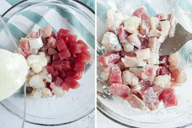 Tagliate tutto il pesce e i gamberi a cubetti.