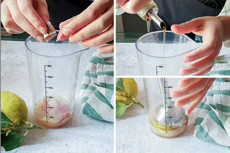 Dedicatevi ora alla preparazione del leche de tigre (latte di tigre). Spremete i limoni ed eliminate gli eventuali semi. Aggiungete l’aglio, lo zenzero grattugiato, qualche cubetto di pesce, due fettine di aji limo e un filo d’olio. Frullate fino ad ottenere una specie di crema.