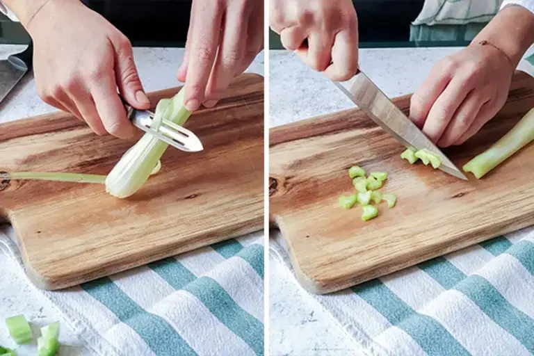 Nel frattempo pelate la cipolla e affettatela finemente. Pelate anche il cetriolo e tagliatelo a cubetti.