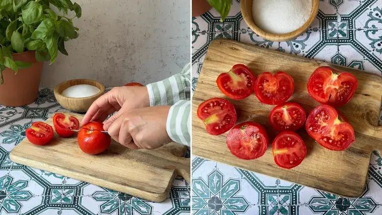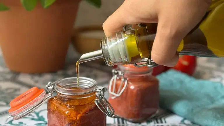 Stendi la salsa così ottenuta su tavole di legno o piatti di ceramica, copri con una retina per alimenti e lascia al sole, mescolando durante il giorno e ritirando di notte. Quando si sarà ben ristretta (dopo 3-5 giorni), trasferiscila nei vasetti, copri con olio extravergine e conserva in frigo.