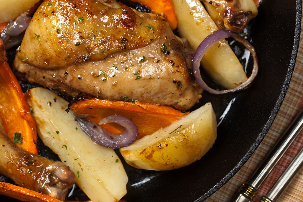 Coprire la padella con un coperchio e cuocere nel forno preriscaldato per 30-40 minuti, o fino a quando il pollo è cotto e le verdure sono tenere.