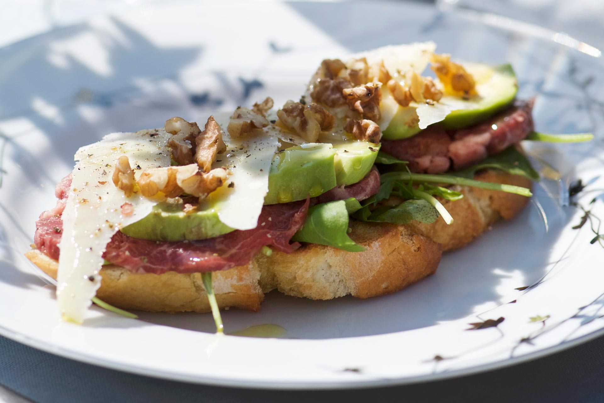 Ricopritele con le fogliette di rucola, il carpaccio, le fette di avocado e con delle fettine sottili di parmigiano.