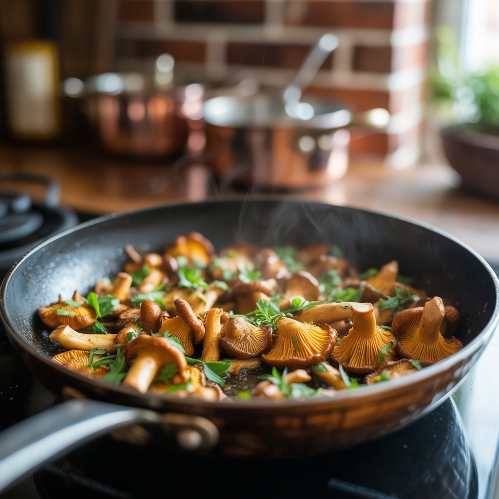 La cottura deve essere rapida per mantenere i funghi teneri ma non acquosi. È preferibile non coprire la padella, così l’umidità in eccesso evapora lasciando i finferli saporiti e consistenti.