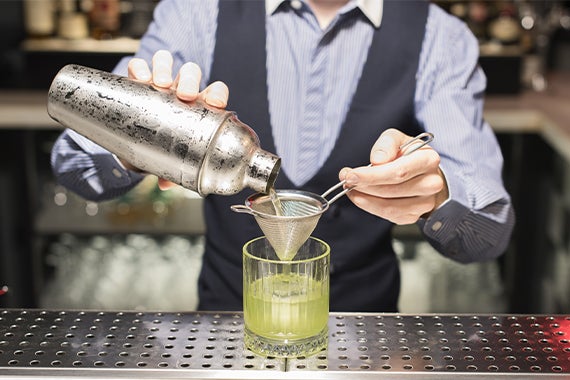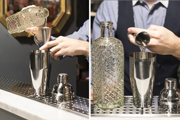 Aprire lo shaker e versare il cocktail filtrandolo con un colino (double strain), il doppio filtraggio viene fatto per evitare che scaglie di ghiaccio possano finire all'interno del bicchiere.
