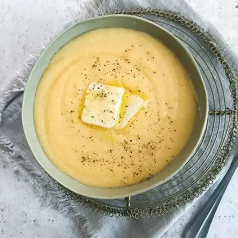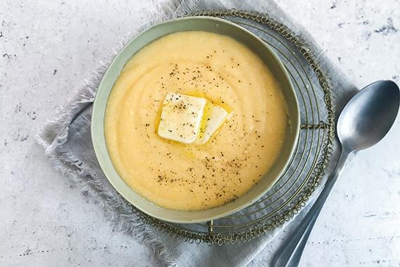 Mettete il grits in una ciotola e decorate con una fettina di burro e una macinata di pepe.