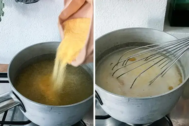 Versate a pioggia la farina di mais e mescolate con una frusta per evitare la formazione di grumi.