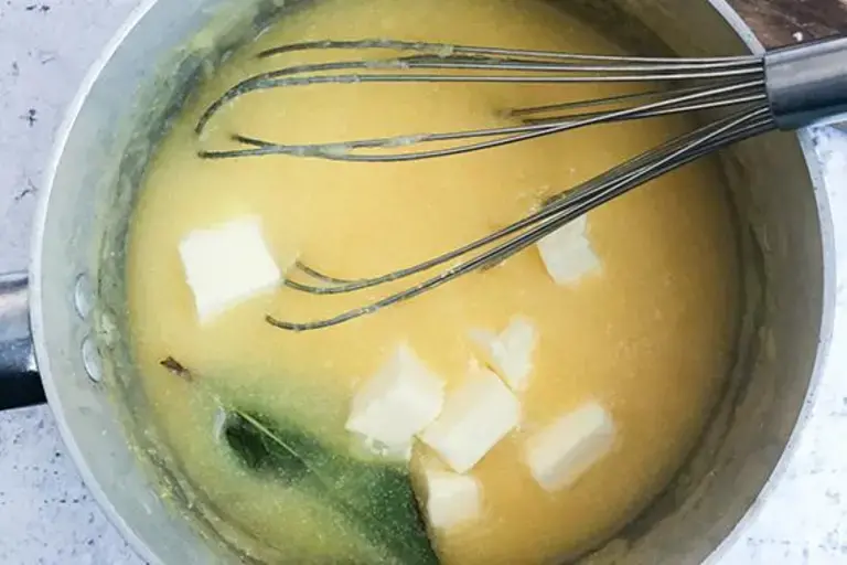 Per preparare il grits, mettete in una pentola il brodo di pollo e l’acqua. Aggiungete anche la foglia di alloro e portate a bollore.