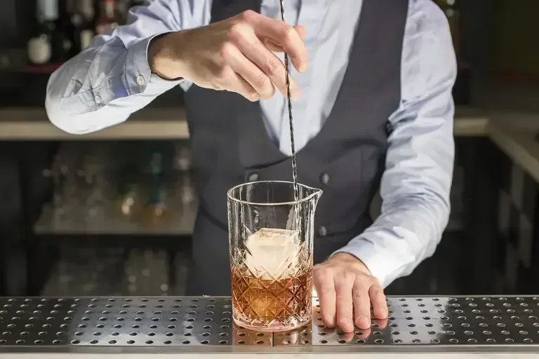 Raffreddate il mixing glass, riempiendolo con dei cubi di ghiaccio fino a 3/4 della sua capienza e mescolando con un barspoon per accelerare il raffreddamento.