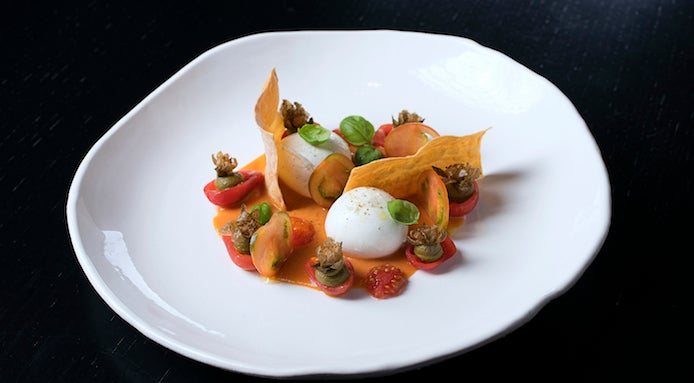Un twist sulla tradizionale insalata caprese a base di mozzarella di bufala, pomodori Camone e pomodorini ciliegino, capperi fritti e crema di melanzane.